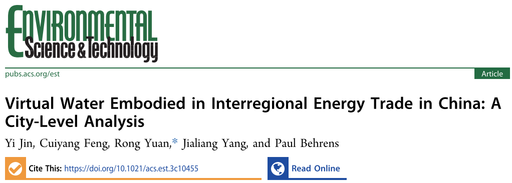 近日,3044永利(产研院)教师金艺在环境领域顶级期刊《Environmental Science & Technology》(Nature Index期刊,IF:11.4)上发表研究论文“Virtual Water Embodied in Interregional Energy Trade in China: A City-Level Analysis”。3044永利为第一完成单位,金艺老师为第一作者。