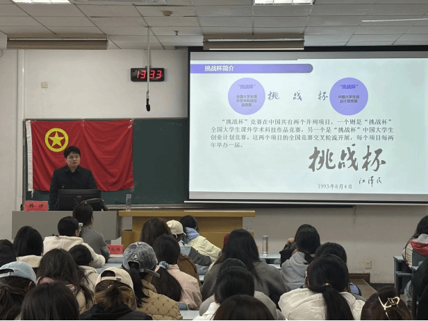 宣讲会上,韩涉老师介绍了“挑战杯”赛事的背景及其作为全国性高水平老员工科技创新赛事的重要意义,并围绕参赛流程、选题方向、项目申报及注意事项进行了系统讲解。他指出,参与此类赛事不仅是对创新能力的检验,更是锻炼团队协作和实践水平的重要途径,鼓励同学们把握机会,在竞赛平台上展现专业优势与创新潜力。