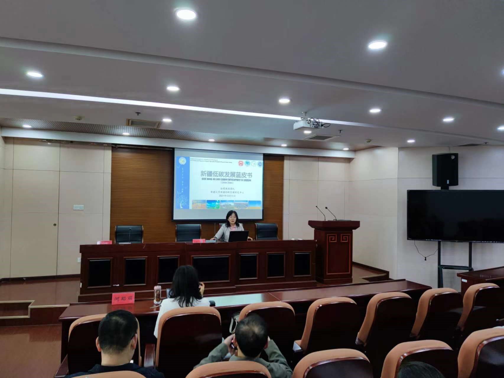 During the meeting, Wang Xiang, Chen Haibo, and Hu Xuhua provided an overview of the development of our School of Finance and Economics and the Industrial Research Institute. Subsequently, Professor Sun Hui delivered an academic lecture titled 'Low Carbon Development Blue Book: Research on Carbon Peak and Carbon Neutrality in Xinjiang.' Professor He Zhaoli briefly shared her latest research achievement on 'Research on the Water Supply and Demand Adaptation of the Tourism Industry in Arid Regions.' There was also an interactive exchange with the teachers and students present. Professor Chen Haibo moderated the academic lecture and the exchange session. More than 60 teachers and students from the School of Finance and Economics and the School of Business Administration attended the lecture and shared their insights.