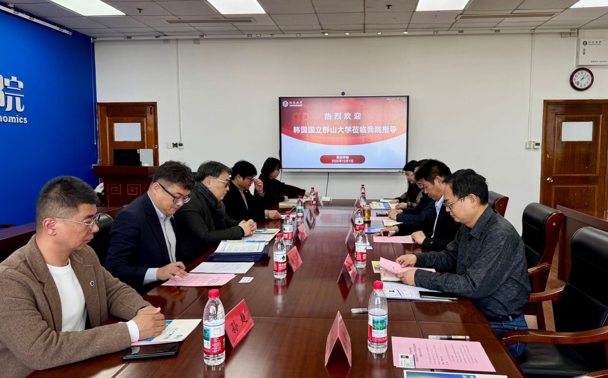 Attending the meeting from Kunsan National University were Professor Choi Myeong-hoon, Dean of the Institute of International Education; Professor Lee Jae-sik from the School of Music; and Mr. Kim In-kyun, Admissions Coordinator of the Institute of International Education. The Jiangsu University delegation included Professor Hu Xuhua, Dean of the School of Finance and Economics; Professor Yan Jun, Vice Dean; Professor Liu Qundong, Deputy Party Secretary and Vice Dean; Ms. Zhu Yanjie, Director of the International Education Office of the School of Finance and Economics; Ms. Zhang Xinyi, Section Chief of Cooperation and Exchange at the University’s International Office; and Ms. Chen Yushan, Director of the Belt and Road International Cooperation Office at the School of Overseas Education.