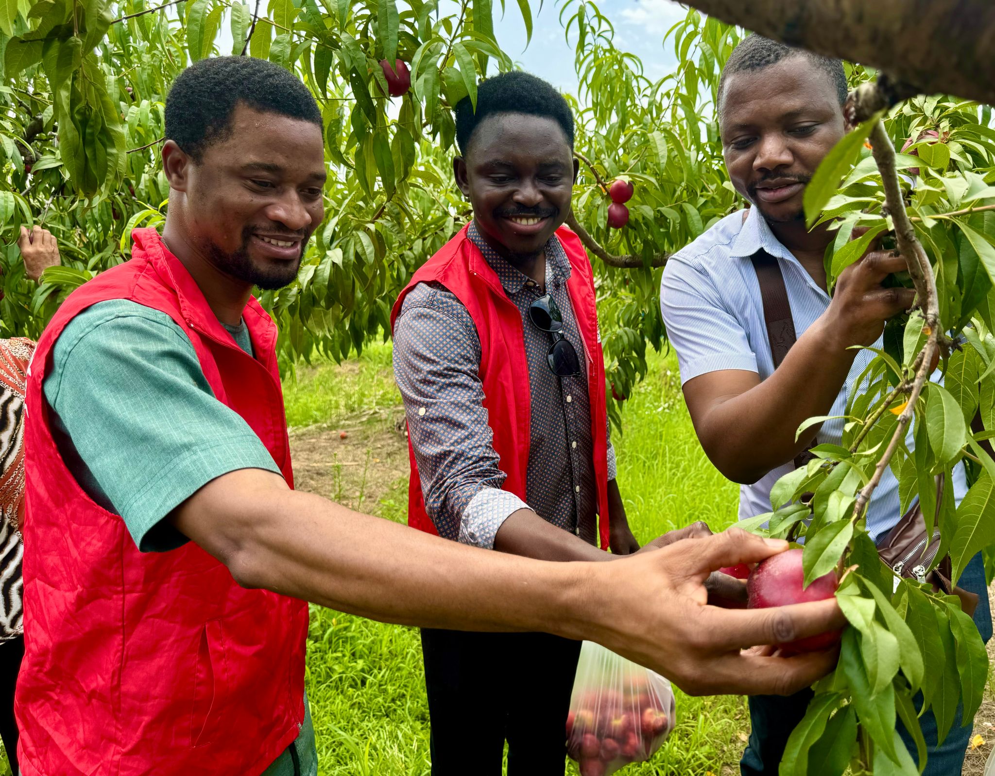 活动当天,来自加纳、刚果、科特迪瓦等国家的国际员工与中国学子一同走进桃园,共同参与了桃子的采摘工作。在经验丰富的果农的指导下,员工们学习了桃树的栽培技术、果实采摘方法以及果园的日常管理。他们身着统一的工作服,手持采摘篮,穿梭于桃林之间,亲手采摘成熟的果实。这一过程不仅让员工们体验到了劳动的乐趣,更加深了他们对农业劳动的认识和尊重。