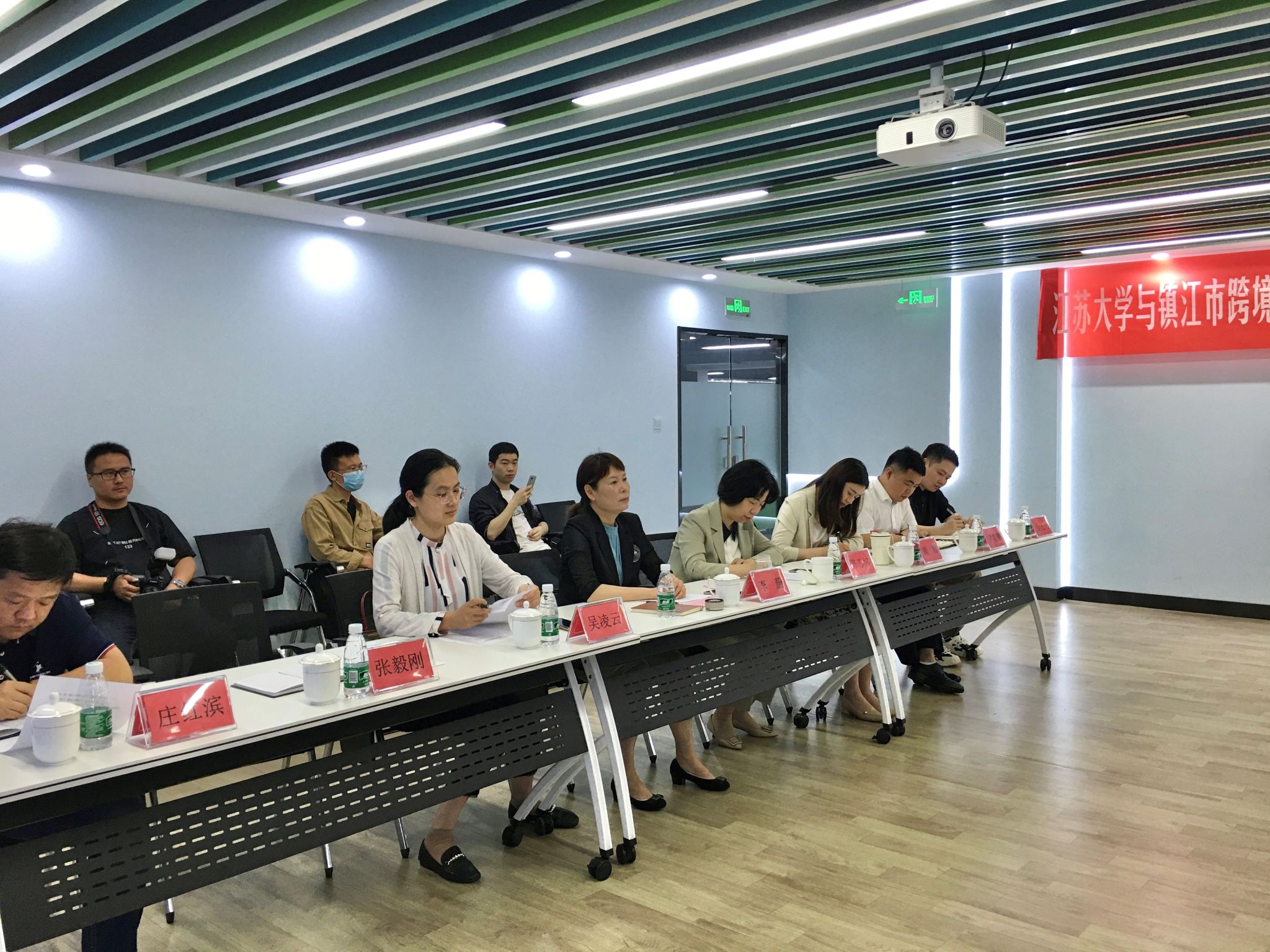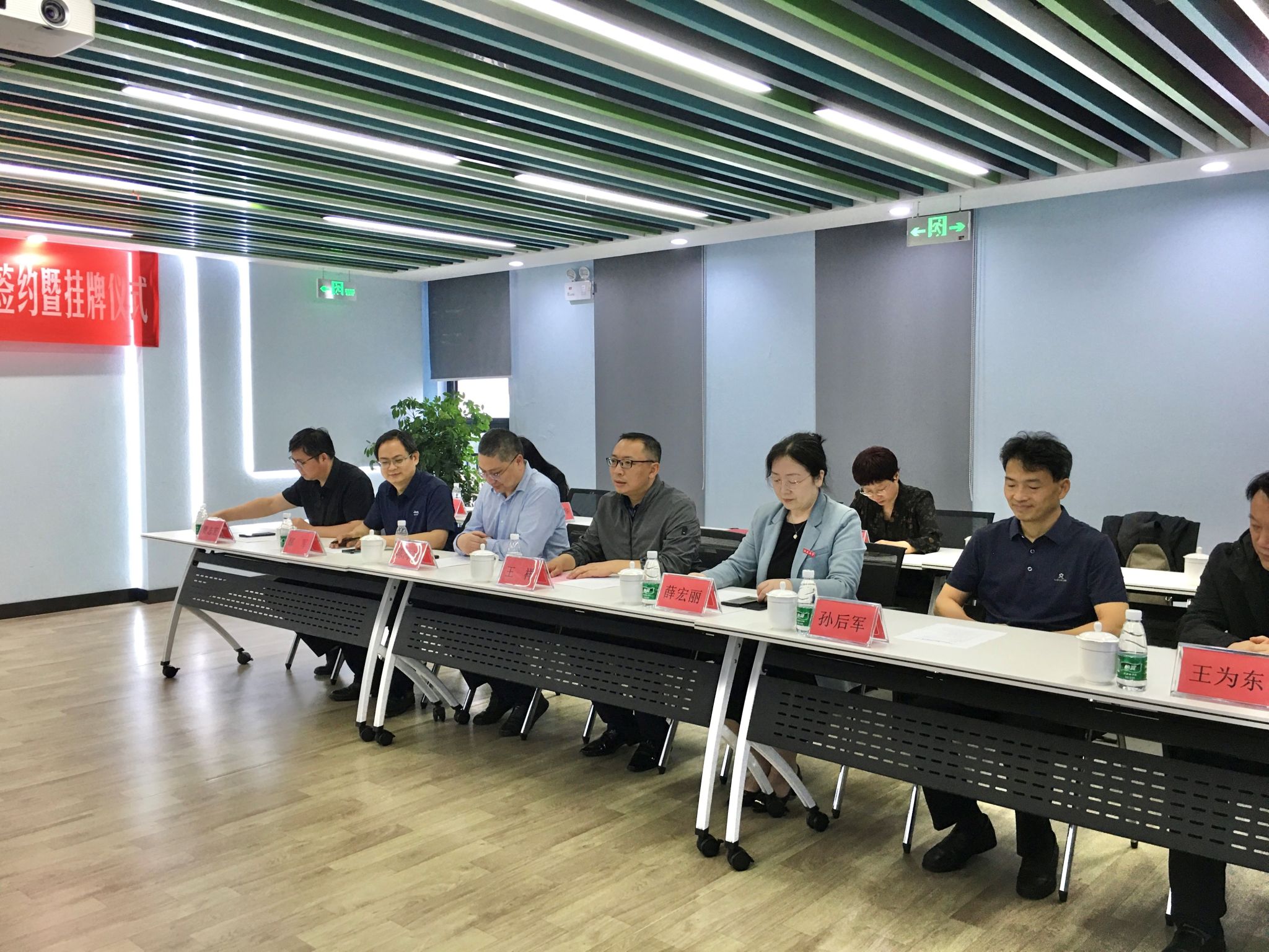 随后,大家一同移步八楼路演厅,举行人才培养共建签约暨挂牌仪式。按照会议安排,鄢军和京口区大禹山创意新社区管委会主任顾颖分别代表校地双方签署有关合作协议。李蔚、薛宏丽为“3044永利产教融合人才培养共建基地”揭牌,陈苏婷、王祥同时为“3044永利实践教学基地”揭牌。