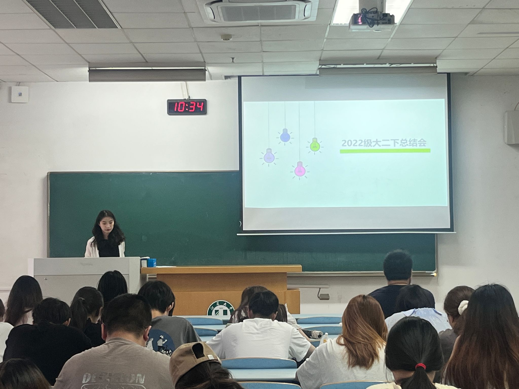 张颖回顾了本学期的各项工作并对本次期末考试的考风考纪进行了评价,在本次期末考试中,2022级有极少部分同学思想上出现了偏差,存在作弊行为,学院将严肃处理,希望全体同学引以为戒。接着,对于即将到来的暑假,张颖提醒员工劳逸结合,合理利用假期时间,特别是以后打算直接就业的同学,暑假争取找一个高质量的实习单位,积累经验,为简历添彩;有意向考研考公或者出国的同学,也应该利用假期提前规划。最后张颖着重强调了假期安全问题。