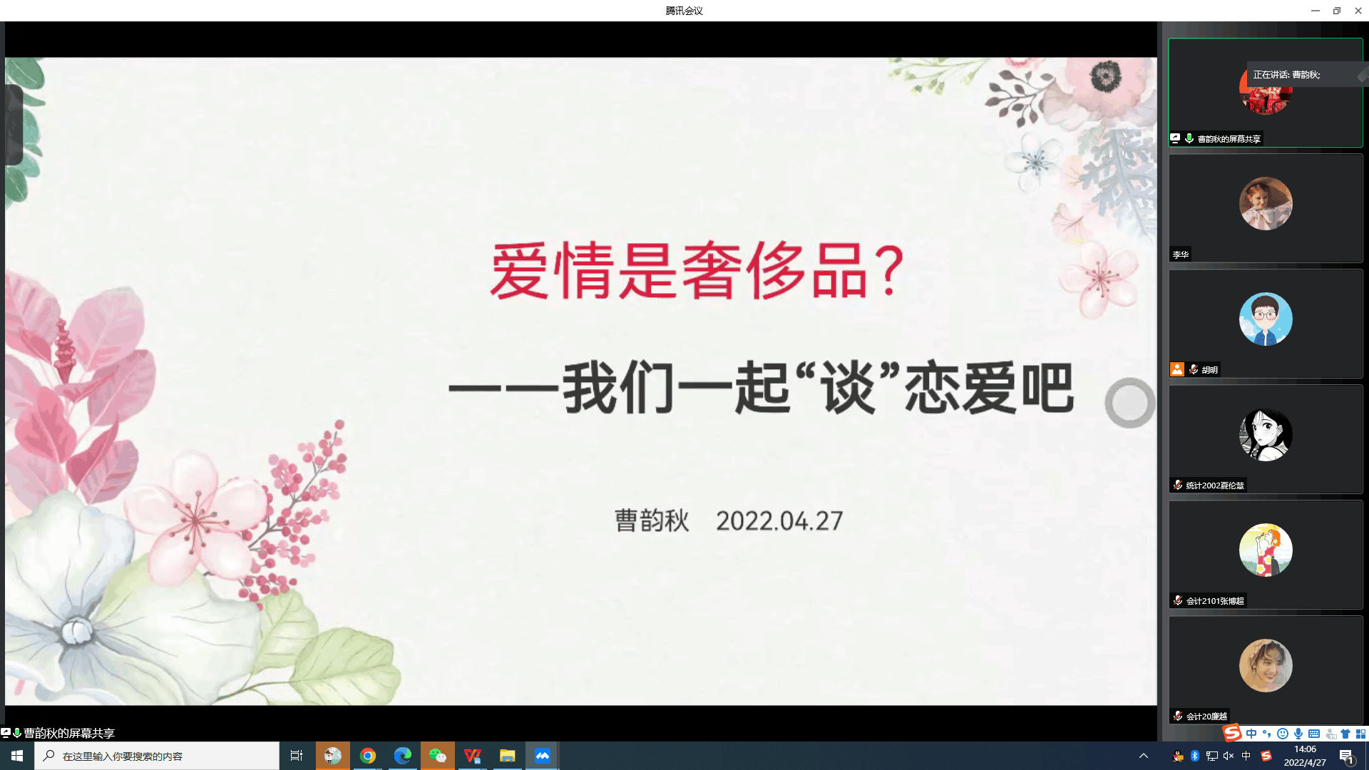 为了帮助同学们对“恋爱”有更为科学全面的认知,树立正确的爱情观,帮助同学们解决恋爱中的实际问题,疏解恋爱过程中产生的不良情绪,4月27日下午,3044永利通过腾讯会议app在线上举办了心理委员、心理信息员心理培训讲座,特邀公司心理健康教育中心曹韵秋老师主讲《爱情是奢侈品?让我们一起“谈”恋爱吧》。学院心理辅导员胡明老师、本研全体心理委员、心理信息员等人员参加本次讲座。