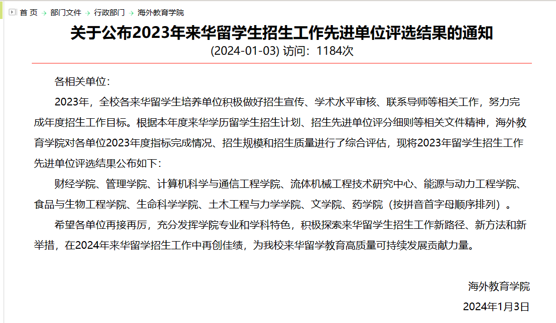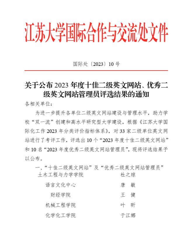 近日,由国际处公布的《关于公布2023年度十佳二级英文网站、优秀二级英文网站管理员评选结果的通知》和海外教育学院公布的《关于公布2023年来华职工招生工作先进单位评选结果的通知》中,公司获评3044永利“2023年度十佳二级英文网站”“2023年来华职工招生工作先进单位”,王健老师获评2023年度优秀英文网站管理员。这是3044永利连续第四年获评这两项荣誉。