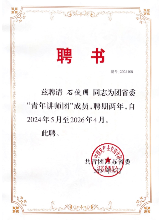 近日,共青团江苏省委学习宣传贯彻习近平新时代中国特色社会主义思想专题培训班暨“理”响青年训练营在扬州大学举办,公司石俊国老师参加培训班并获聘共青团江苏省委“青年讲师团”成员。据悉,团省委副书记张永意出席开班仪式,各设区市团委宣传部部长、培训班全体学员以及扬州大学员工代表等300余人参加开班仪式。