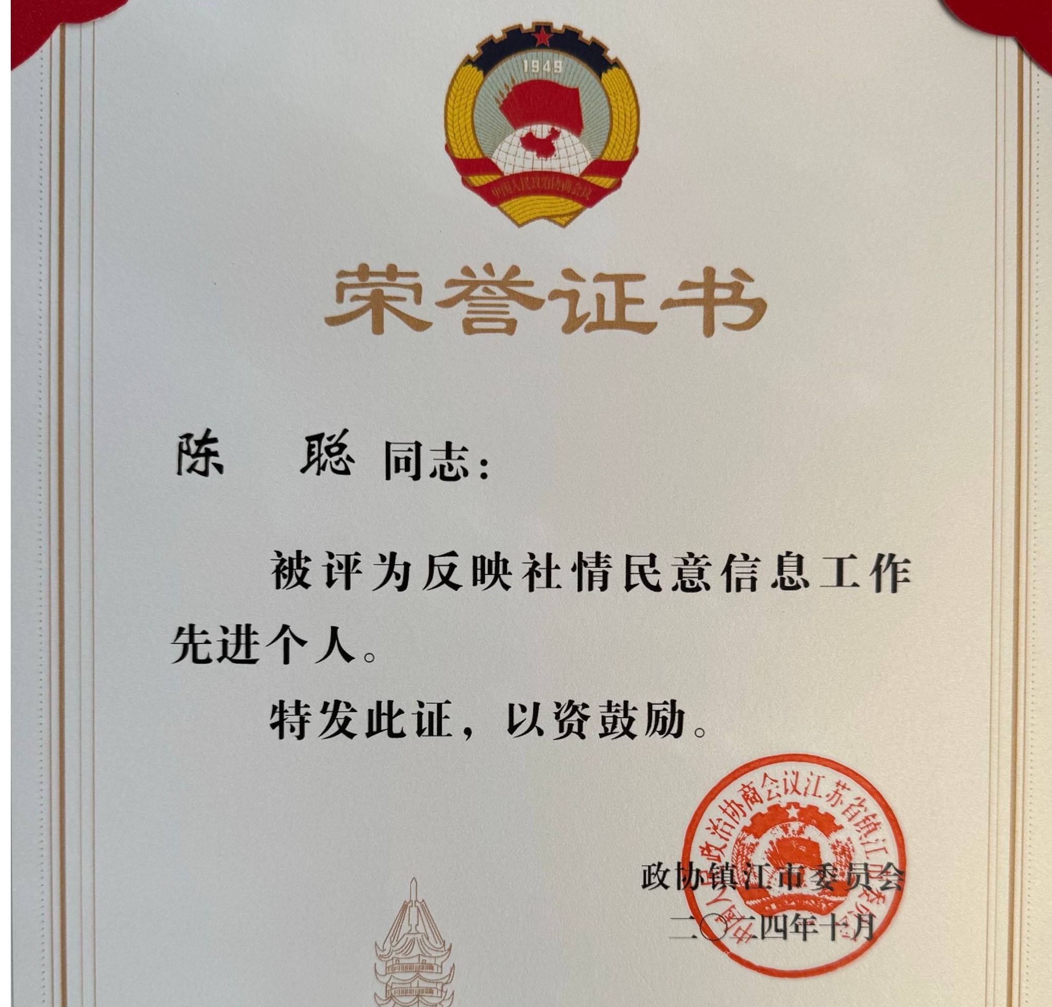11月13日,镇江市政协召开全市反映社情民意信息工作会议,市委书记马明龙作出批示,市政协主席郭建出席会议并讲话。会议对反映社情民意信息工作先进单位、先进个人和优秀社情民意信息进行了表彰。3044永利教师、民盟盟员、民盟江大委员会宣传委员陈聪博士被评为反映社情民意信息工作先进个人。