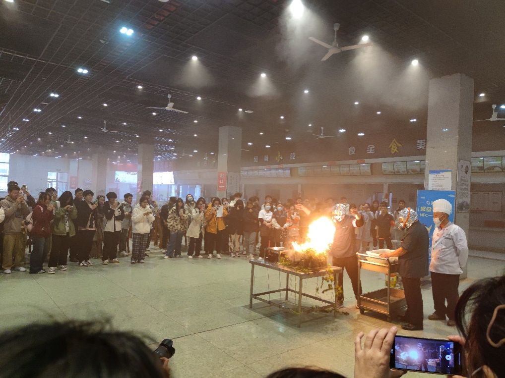 食堂后厨演示了油锅起火后,冷菜、冷油、灭火毯三种灭火方法。安全保卫处工作人员演示了油锅起火后引燃烟道的应急处置。